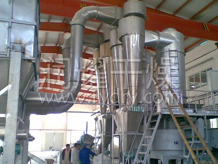熱空氣由進風口(kǒu)以適宜的噴動速度從(cóng)幹燥機底部進入攪(jiǎo)拌粉碎幹燥室,對物料強烈的剪切(qiē)、吹浮、旋轉作用,於是物料受到離(lí)心、剪切、碰撞、磨擦而被微粒化,強化了傳質傳熱。在幹燥機(jī)底部,較大較濕顆粒團在(zài)攪拌器的作用(yòng)下被機械破碎,濕含量較低、顆粒度較小的顆粒被旋轉氣流夾帶上升(shēng),在上升的過程中進一步幹燥,由(yóu)於氣固相作旋(xuán)轉流動,固相慣性大於氣相,固氣兩相間的(de)相對速度較大,強化兩相間(jiān)的傳(chuán)熱效果,所以該機幹燥強度高。